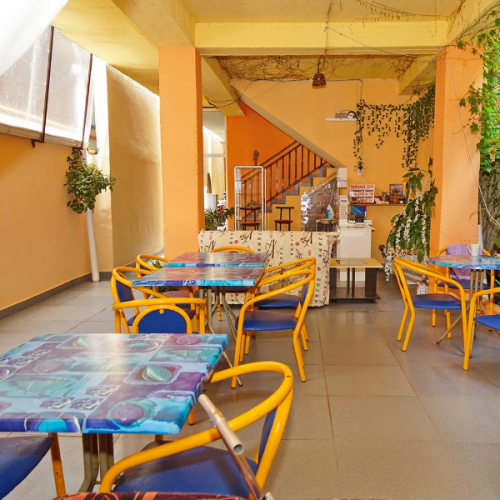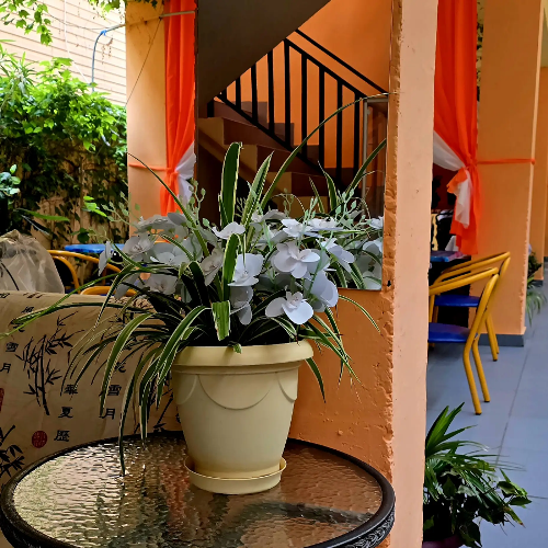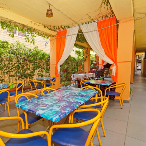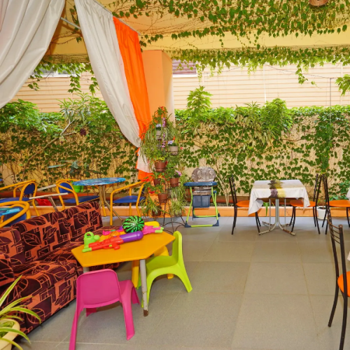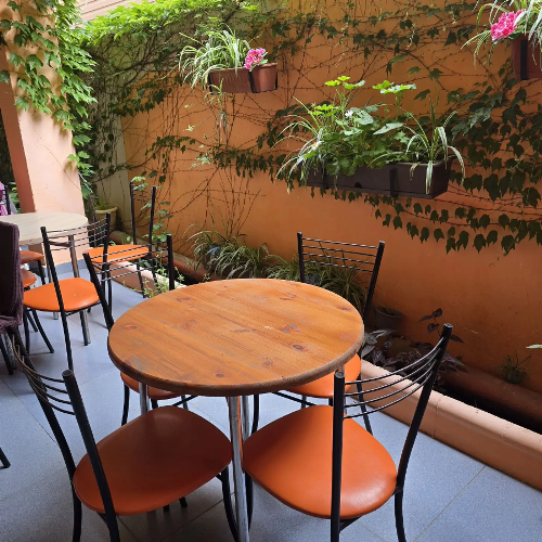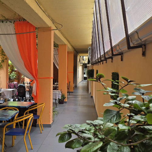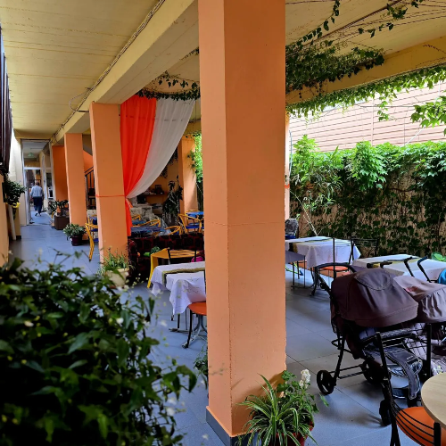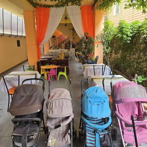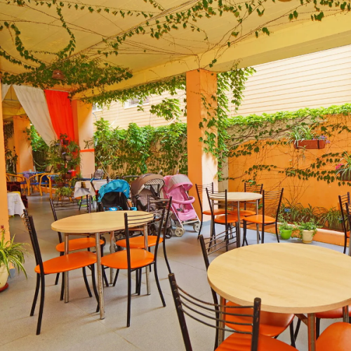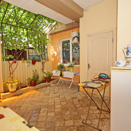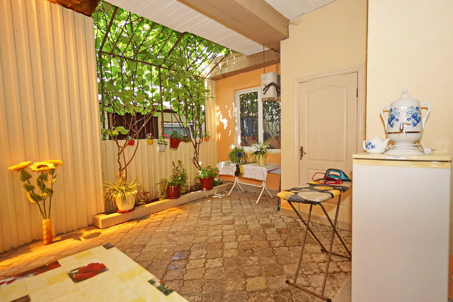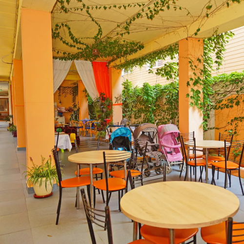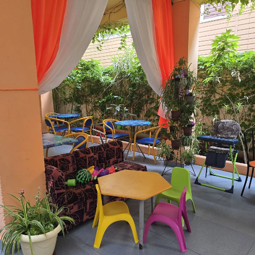 Во дворе очень зелено и всегда прохладно, стоят столики для посиделок, детский уголок, диванная зона, где можно пообедать или поужинать.